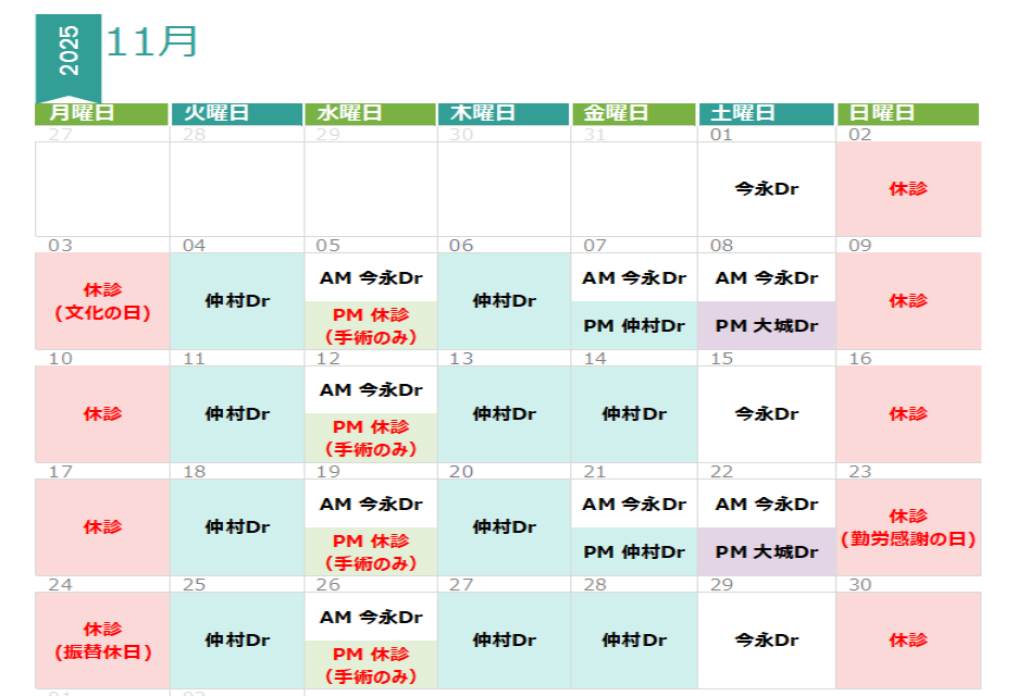 ※水曜日は、AM11:00受付締め切りです。PMは手術の為、外来診療は行っておりません。